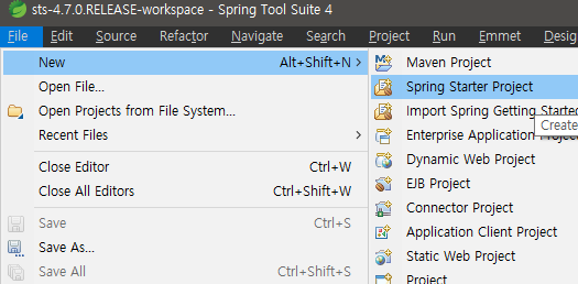 - 아래 그림과 같이 sts(Spring Tool Suite) 이클립스에서 New > Spring Starter Project