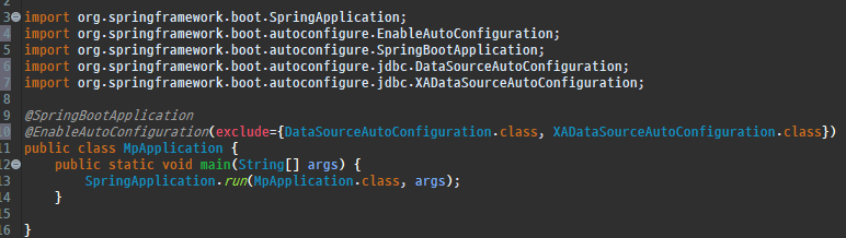 @EnableAutoConfiguration(exclude={DataSourceAutoConfiguration.class, XADataSourceAutoConfiguration.class})