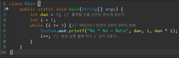 - while 문을 사용해서 구구단 7단을 출력해보았다.
