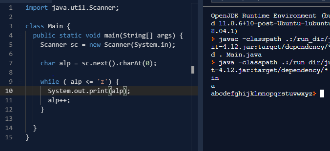 알파벳을 입력 후 입력한 문자로부터 'z' 까지 출력해보자