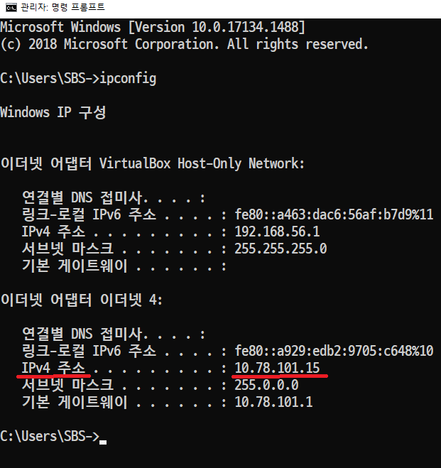 IPv4 주소.............. 10.78.101.15 가 컴퓨터의 ip 주소이다.